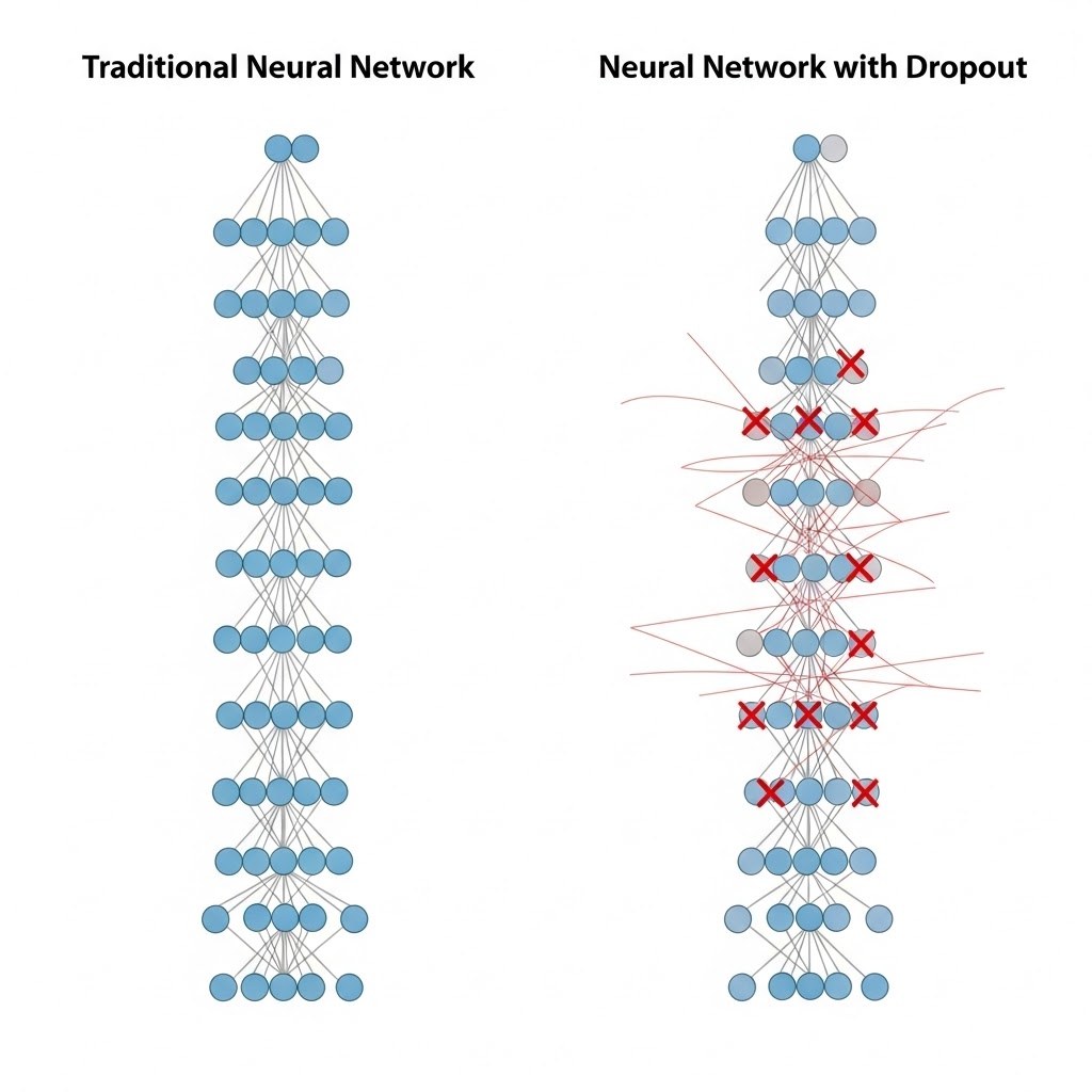 딥러닝 모델이 복잡해질수록 모델은 훈련 데이터에 너무 완벽하게 적응해버리는 과적합(Overfitting) 문제에 직면하게 됩니다. 이를 해결하기 위해 2014년 힌튼(Geoffrey Hinton) 교수팀이 제안한 혁신적인 기법이 바로 드롭아웃(Dropout)입니다.