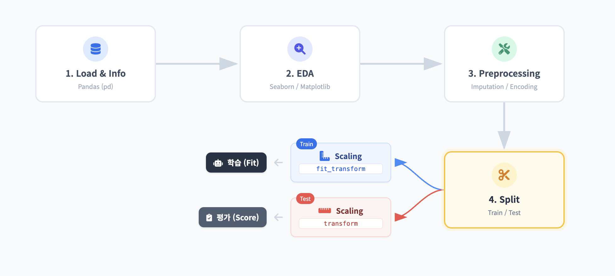 만약 Test 데이터로 다시 fit을 해버리면, 모의고사를 보는데 수능 정답 분포를 미리 훔쳐보고 공부하는 것과 같습니다. 이를 데이터 누수(Data Leakage)라고 하며, 실무에서 치명적인 실수입니