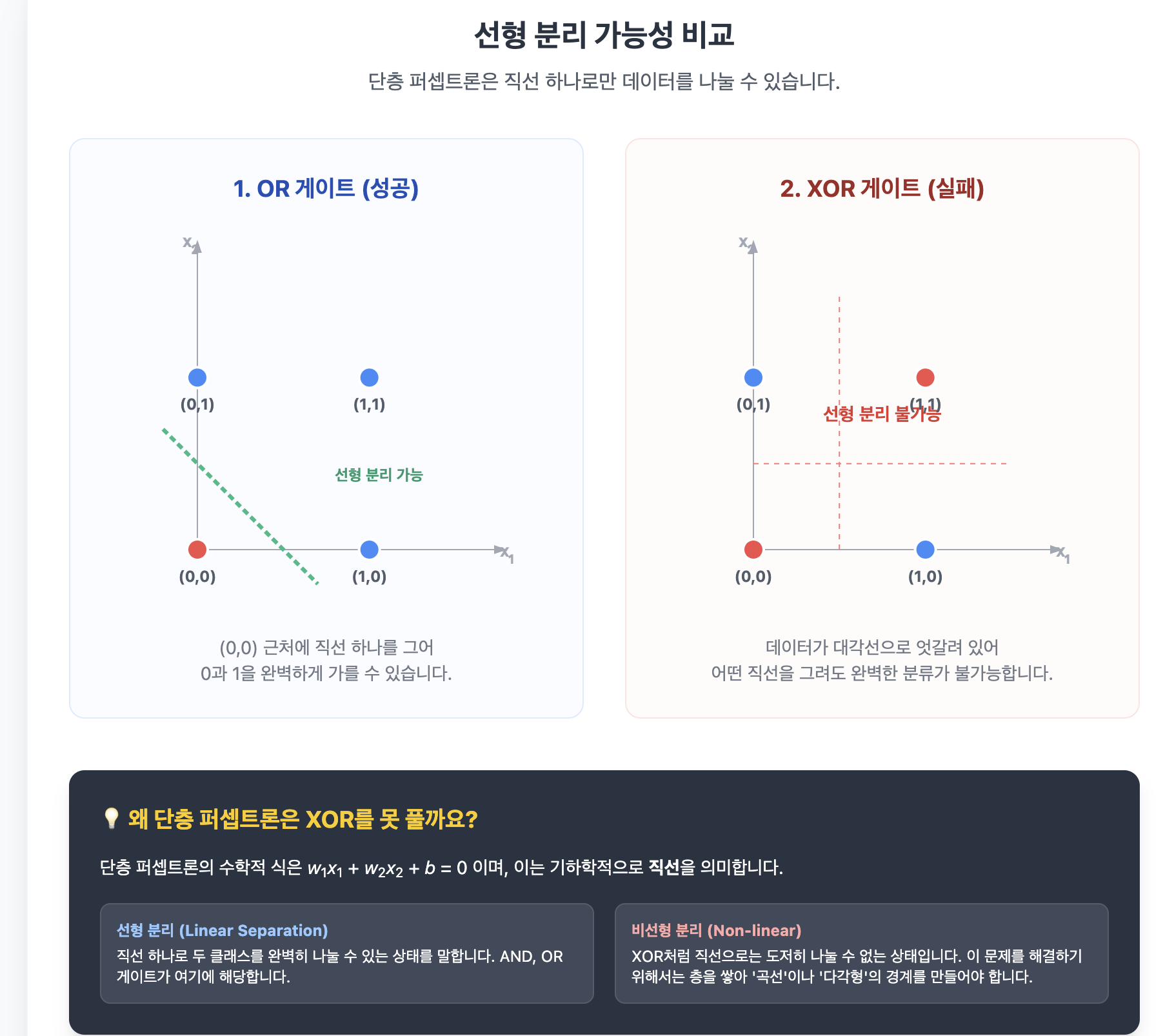 - XOR 문제: 하지만 입력값이 서로 다를 때만 1이 되는 XOR는 어떤 직선을 그어도 0과 1을 분리할 수 없습니다.