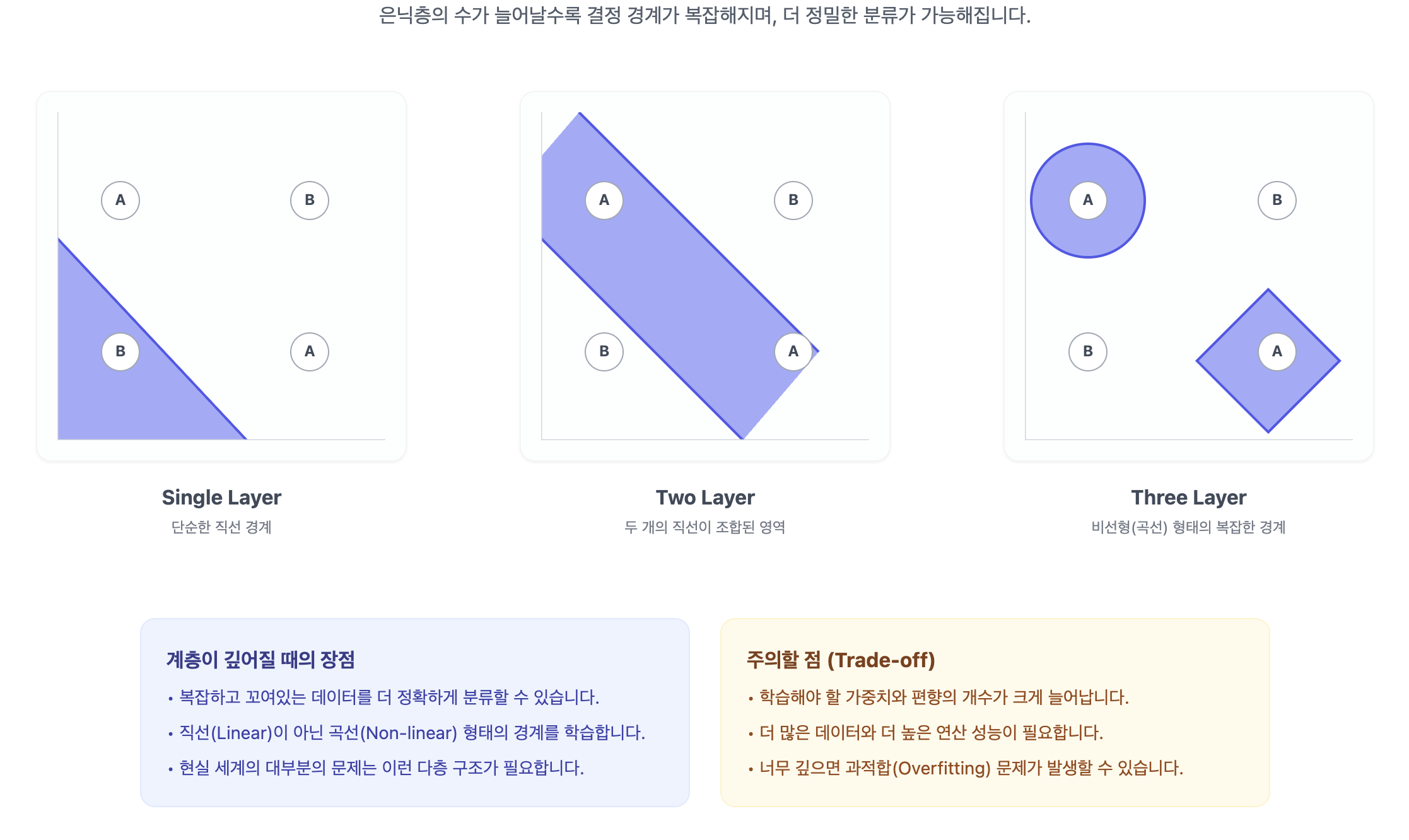 - 결국 XOR 문제뿐만 아니라 훨씬 더 복잡한 패턴(이미지, 음성 등)도 인식할 수 있게 됩니다.
