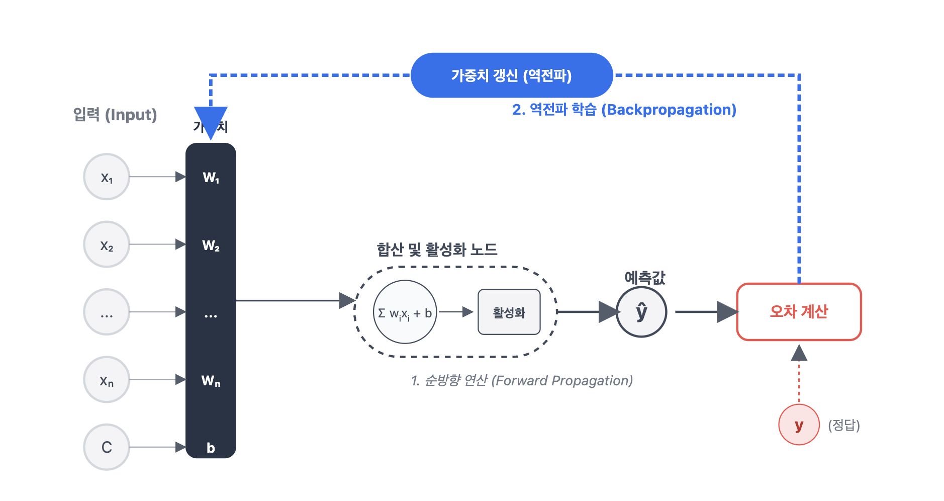 $$y = f(\sum_{i=1}^{n} (w_i x_i) + b)$$[입력($x$) × 가중치($w$) + 편향($b$)] → 활성화 함수 → 출력($y$)
