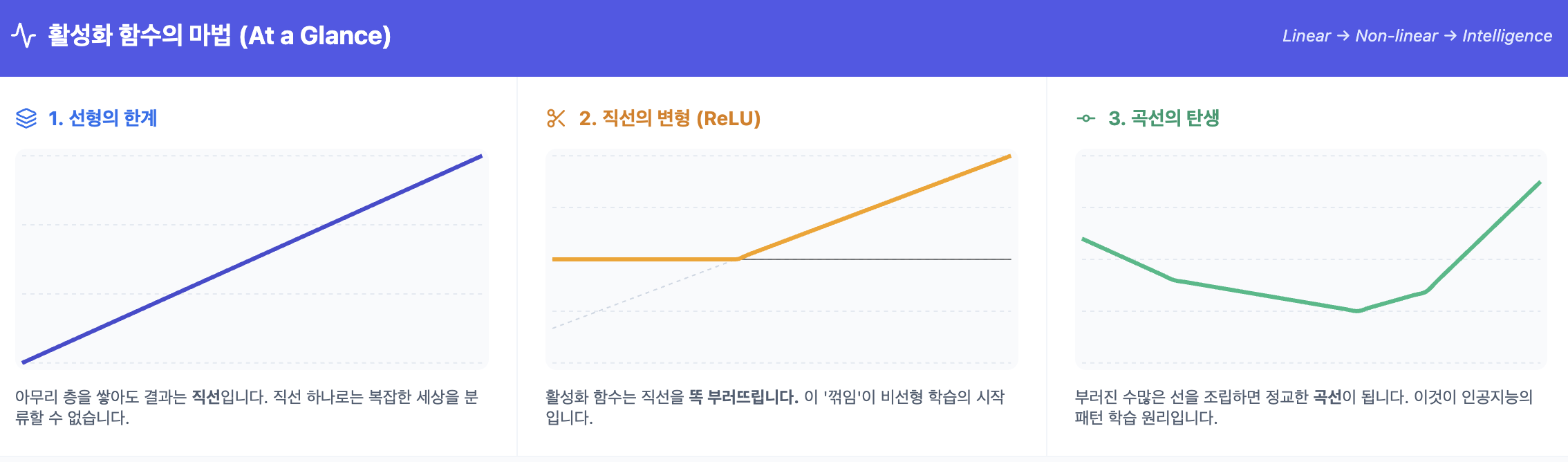 - 직선의 변형: $wx+b$라는 단순한 직선은 활성화 함수를 만나 꺾인 선(ReLU)이나 휘어진 선(Sigmoid)이 됩니다.