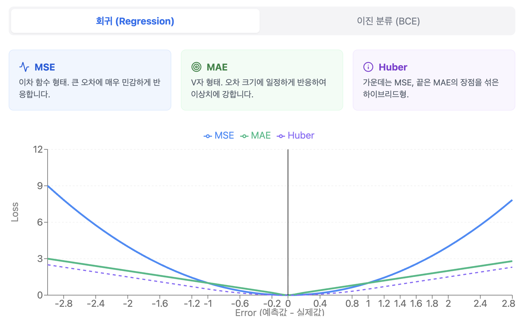 - 심층 분석: MSE의 장점인 '부드러운 최적화'와 MAE의 장점인 '이상치에 대한 강인함'을 모두 가집니다. 학습 초기에는 빠르게, 최적값 근처에서는 안정적으로 수렴하도록 돕습니다.